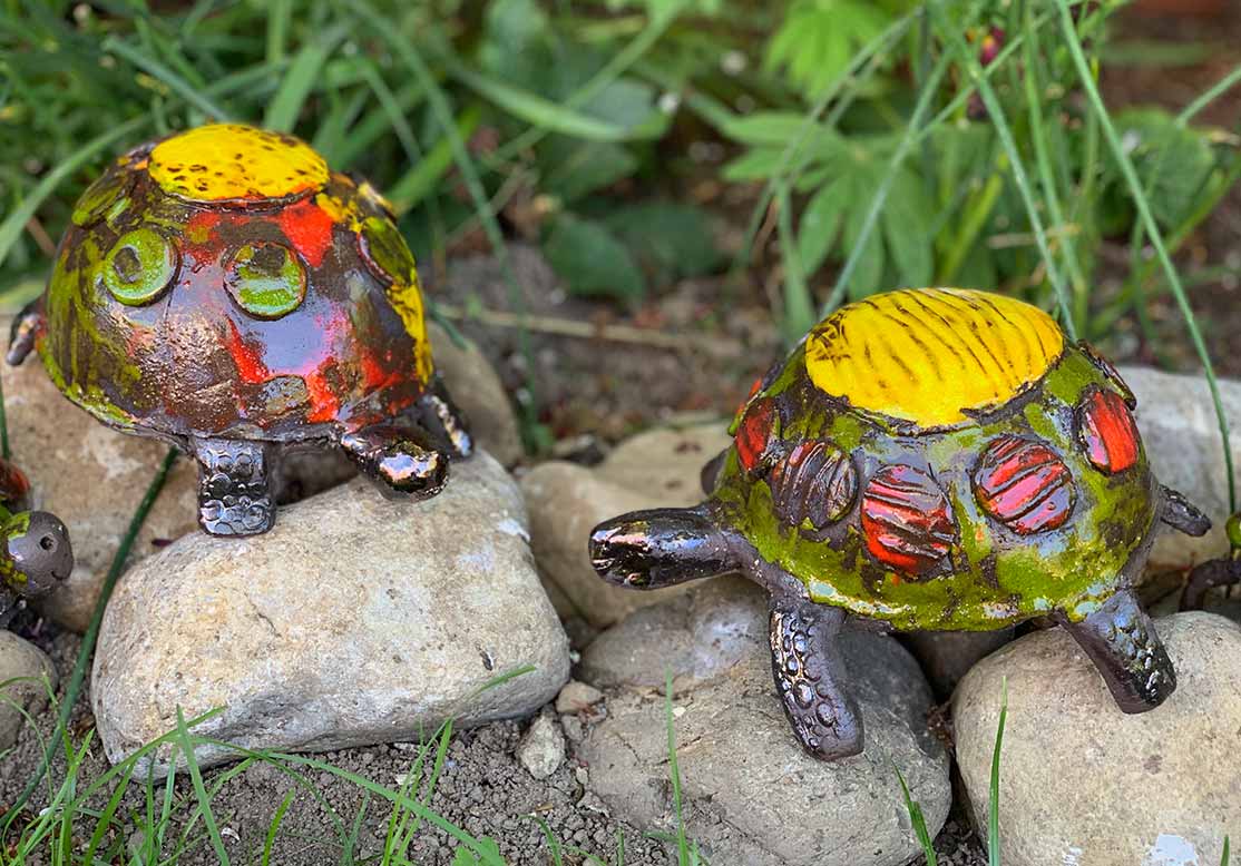 Am 11 und 25. Mai wurde es tierisch gut in meinem Atelier. Wir modellierten neue Mitbewohner für Garten oder Balkon. So entstanden Schildkröten aus Manganton (dunkler Ton) und Drachen aus schamottiertem Ton. Die von Hand modellierten Tiere wurden mit Pinsel glasiert und danach noch einmal von mir gebrannt.